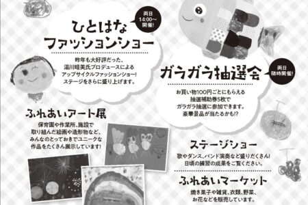 作品展、舞台発表、フリーマーケット、屋台ほか、アップサイクルファッションショー(両日14:00)やガラガラ抽選会(随時)など。