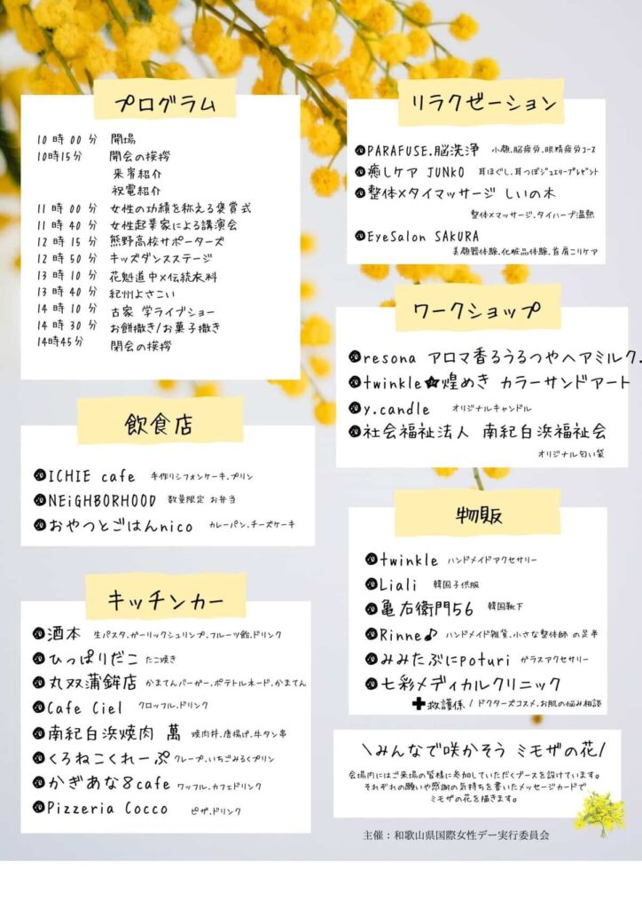 キッチンカー、ステージイベント、ワークショップ、癒し体験、雑貨・グルメ販売、など盛りだくさん! 閉会後にお餅・お菓子まきもあります!