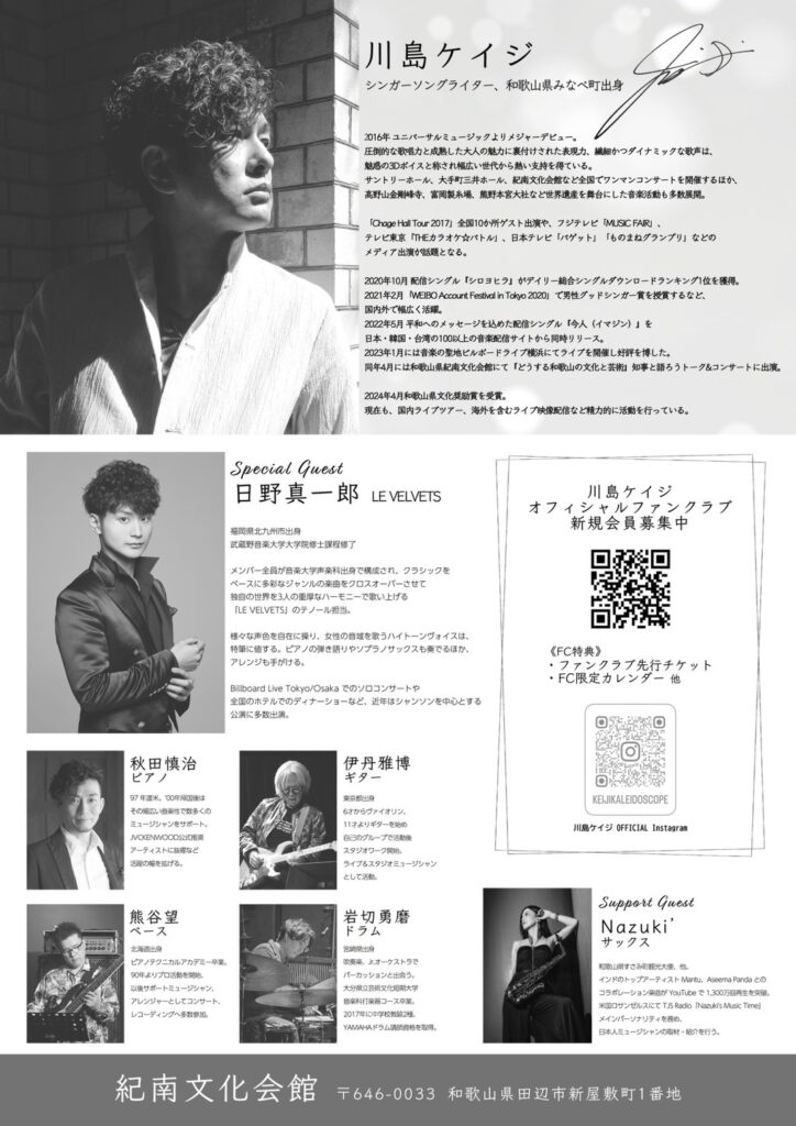 | 料 金 | S席 5,500円/A席 4,500円/B席 3,500円 ※紀南文化会館の窓口にてお買い求めいただく場合、通常価格より500円割引の特別価格でご購入いただけます。 |