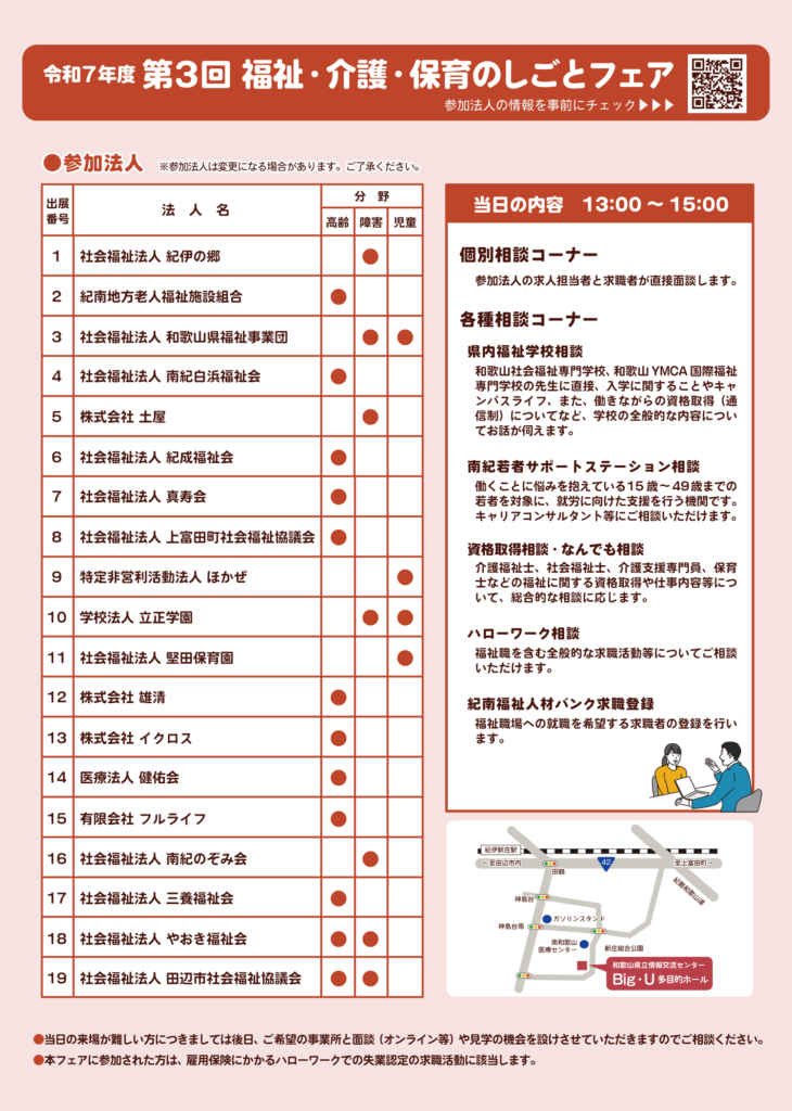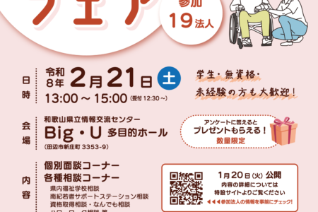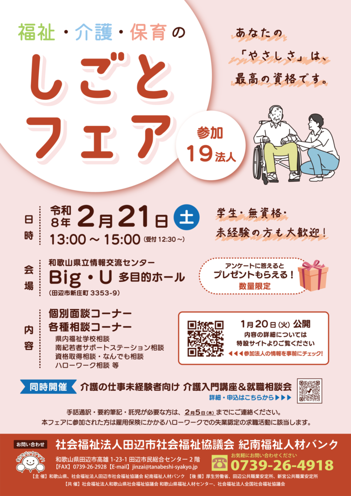 | お問合せ | 田辺市社会福祉協議会 紀南福祉人材バンク TEL.0739-26-4918 |